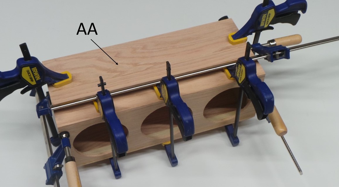 Glue the front board “C” to one of the side boards “AA”. Make sure that Lamp Holder Support “EF” is on the far side from the front board “C”. Use clamps to secure boards, and use blocks with square corners to keep the joint at a right angle.